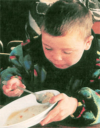 Für Kinder, die in ihrem Zuhause nicht gut versorgt wurden, war es manchmal die einzige Mahlzeit am Tag. Wir bezahlten das Essen. Wir brauchten besonders im Winter Geld, weil im Winter manchmal mehr als 40 Kinder am Tag kamen, die Hunger hatten. |